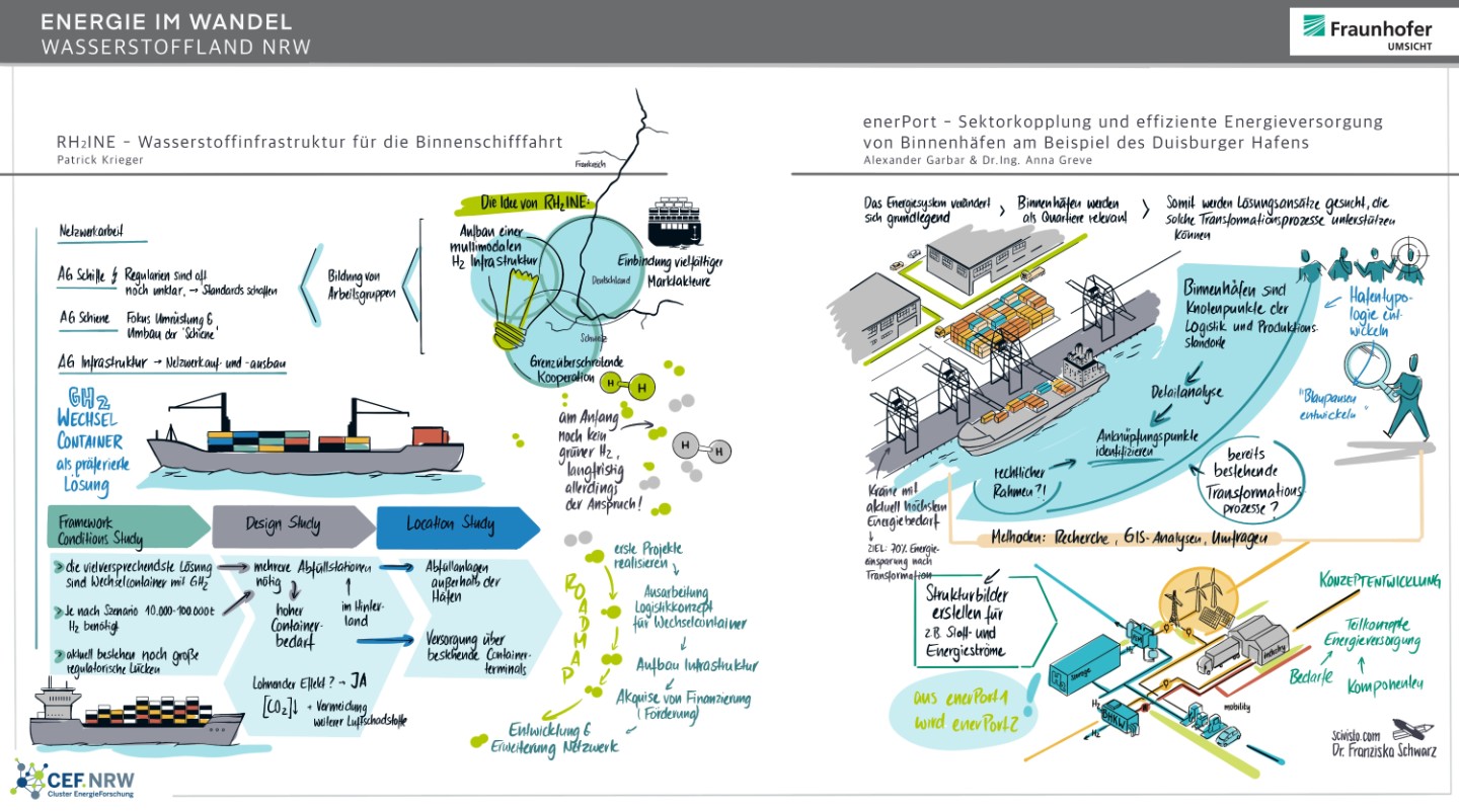 Der Binnenhafen Duisburg steht auch im Zentrum des Projektes enerPort – vorgestellt von Alexander Garbar von der Duisburger Hafen AG und Dr.-Ing. Anna Grevé, Leiterin der Abteilung »Elektrochemische Energiespeicher« am Fraunhofer UMSICHT. »Wir befassen uns mit der Frage, wie Binnenhäfen bei energetischen Transformationsprozessen unterstützt werden können«, fasste die Wissenschaftlerin die Ausrichtung der Forschungsaktivitäten zusammen. »Dabei betrachten wir den Hafen als Quartier, verknüpfen alle Stakeholder und achten gleichzeitig auf die Übertragbarkeit unserer Konzepte auf andere Binnenhäfen.«
