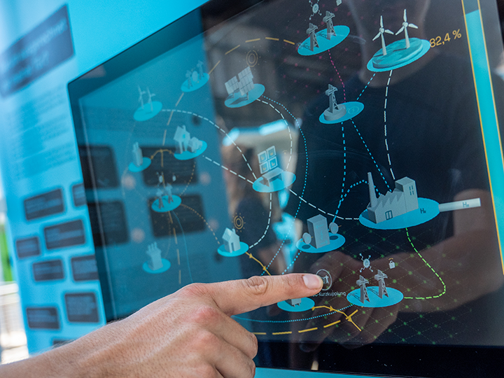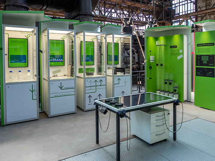 In vier Bereichen stellt die Ausstellung Wege der Energiewende vor: In der Themeninsel Vernetzen dreht sich alles darum, wie erneuerbare Energien dahin gelangen, wo sie gebraucht werden. Wie auch die Industrie flexibel auf Energieangebot und -nachfrage reagieren kann, steht im Fokus der Themeninsel Verteilen. Dass Industrieabgase auch sinnvoll genutzt und als Rohstoffe weiterverwendet werden können, zeigt der Bereich Verwerten. In der Themeninsel Verwandeln geht es um klimaneutralen Transport für Personen und Waren.
