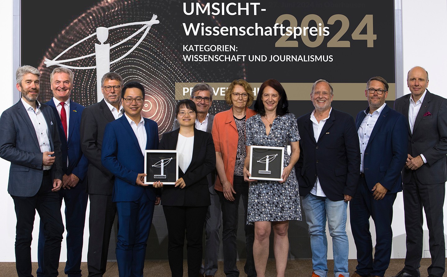 Der Förderverein des Fraunhofer UMSICHT hat in diesem Jahr zum 15. Mal den UMSICHT-Wissenschaftspreis verliehen. Im Fokus standen einmal mehr Menschen, die wissenschaftliche Themen verständlich kommunizieren. Die Auszeichnung ging an Katharina Nickoleit in der Kategorie Journalismus und das Team Dr. Jingyuan Xu und Dr. Gan Huang in der Kategorie Wissenschaft. Die Gäste erfuhren im Rahmen der Preisverleihung mehr über das »Überleben in der Heißzeit« in den klimawandelbedingten Hitzeperioden im globalen Süden und eine neuartige Solartechnologie, mit der sich nicht nur elektrische Energie, sondern auch Wärme oder Trinkwasser erzeugen lassen.